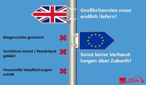 Auch die aktuelle Verhandlungsrunde zwischen der EU und UK endet ohne Ergebnis. Das Verhalten der britischen Seite ist ebenso verantwortungslos wie realitätsfern. Jetzt setzt EU-Chefunterhändler Michel Barnier den Briten zu Recht eine Frist von zwei Wochen, um endlich Flagge zu zeigen. Unsere Position ist klar: Keine Verhandlungen über die zukünftigen Beziehungen zwischen der EU und dem Königreich solange es nicht Klarheit in den Bereichen Bürgerrechte, Irland / Nordirland und den finanziellen Verpflichtungen gibt. Over and out!