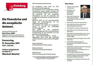 Mitschuld daran ist das unverantwortliche Zögern der Bundesregierung, die nur halbherzige Schritte zu lässt. Wir brauchen eine Politik mit europäischen Format. Es braucht ein nachhaltiges Krisenmanagement. Dazu gehören z.B. eine europäische Wirtschaftsregierung, mehr an demokratischer Verantwortung für das Parlament und eine gerechtere Lastenverteilung. Der baden-württembergische Europaabgeordnete Peter Simon gibt Fingerzeige, welche Antworten Europa auf diese Krise geben muss.