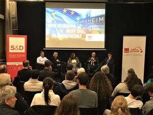 „Wie Europa bist Du Mannheim?“ - Lebhafte Podiums- und Publikumsdiskussion im Musikpark Mannheim. Eingeladen hatte ich hierzu Ralf Eisenhauer, Fraktionsvorsitzender der SPD Mannheim, Dr. Christine Brockmann, Geschäftsführerin der Metropolregion Rhein-Neckar GmbH, und David Linse, Leiter des Fachbereiches Internationales, Europa und Protokoll der Stadt Mannheim, die unter der kompetenten Moderation von Frauke Hess (Rhein-Neckar-Fernsehen) vor vollem Haus zwei Stunden wie im Flug vergehen ließen