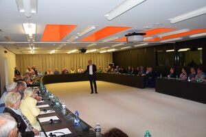 64-köpfige durch und durch junggebliebene Gruppe um ehemaligen Weinheimer Oberbürgermeister Uwe Kleefot und Ehefrau Traude zu Besuch im Europaparlament